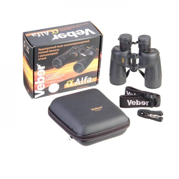 Бинокль Veber Alfa 8x42 WP - современный профессиональный полевой бинокль со встроенной угломерной шкалой и широкоугольной светосильной оптикой. Окуляры бинокля включают асферические элементы, благодаря которым поле зрения бинокля Alfa 8x42 стало больше на 10% по сравнению со стандартным, в нем полностью отсутствуют искажения (кривизна изображения) даже на самом краю поля зрения. Благодаря многослойному просветлению всех оптических элементов наблюдаемая картинка контрастная, резкая и ясная даже в сумерках. Бинокль имеет обрезиненный литой алюмомагниевый корпус, металлические мосты и оправы окуляров. Благодаря новой конструкции блока Porro-призм (выполнены из оптического стекла BAK-4) ,он имеет не только стандартное противоударное исполнение, но он также стоек и к продолжительным вибрационным воздействиям (к примеру возникающим при передвижении по пересеченной местности на автомобиле). Как у любого профессионального бинокля, у Veber Alfa 8x42 WP раздельная фокусировка окуляров, азотонаполнение и класс защиты от воды JIS-6. Как правило, угломерную шкалу можно использовать только при настройке бинокля «на бесконечность», однако при введении диоптрийной поправки, она выходит из резкости. Особенность оптической схемы бинокля Veber Alfa в том, что шкала установлена точно в фокальной плоскости объектива и она остается в резкости при введении диоптрийной поправки.