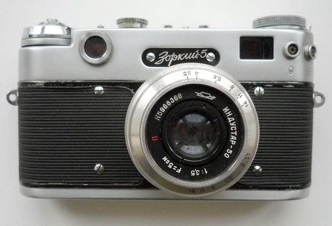 Фотоаппарат Зоркий-5 с объективом Индустар-50 представляет собой советский дальномерный фотоаппарат, выпускавшийся Красногорским механическим заводом (КМЗ) в 1958-1959 годах. Корпус фотоаппарата Зоркий-5 был отлит под давлением из лёгкого металлического сплава со съёмной нижней крышкой для зарядки фотопленки. Эта модель обладает возможностью установки выдержек как до, так и после взвода затвора. Автоспуск отсутствует, зато имеется синхронизатор с постоянным временем упреждения. Видоискатель с диоптрийной коррекцией совмещен с дальномером с базой 65мм, выдержка от 1/500 сек до 1/25 сек и длительная. Данный фотоаппарат продавался по невысокой цене и был выпущен в количестве 236502 штук.