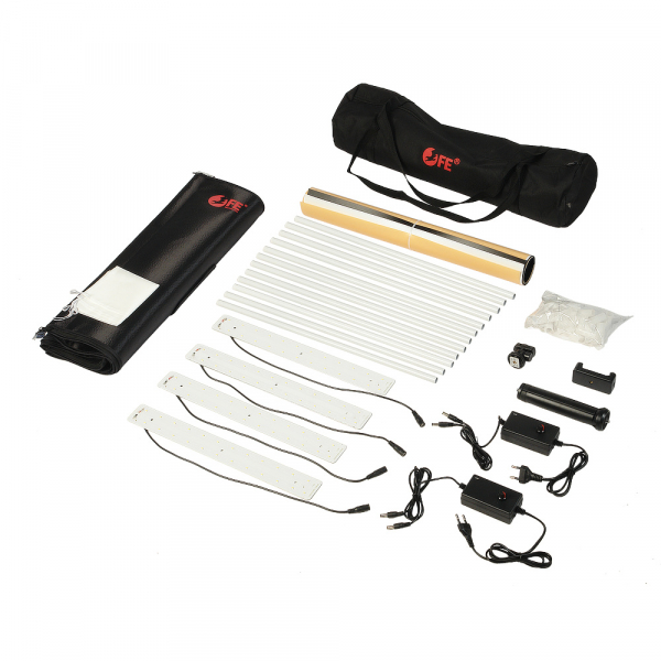 Для получения более рассеянного света можно использовать тканевый диффузор (рассеиватель) из комплекта, который крепится на петлях к металлическому каркасу. При таком освещении объекты фотографирования имеют более презентабельный вид, не отбрасывают жестких теней и рефлексов - соответственно снижается время на постобработку снимков. Яркость света светодиодов плавно регулируется двумя регуляторами мощности - диммерами, входящими в комплект поставки. Каждый из диммеров одновременно регулирует 2 планки света, прикрепленные к одному регулятору мощности.