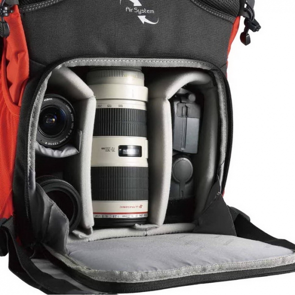 • Вместимость: зеркальная камера с объективом + 3-4 объектива + вспышка + аксессуары + планшет + монопод или штатив