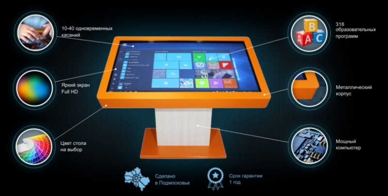 Интерактивный наклонный стол Project touch 32. Металлический корпус, Full HD разрешение (1920х1080), диагональ 32" (81 см), поддержка 10 касаний одновременно. Встроенный компьютер, оперативной памятью 4 Gb и жестким диском SSD 60 Gb. ОС Win 10. Предустановлены развивающие игры. Наклонный механизм стола. Сделано в России!