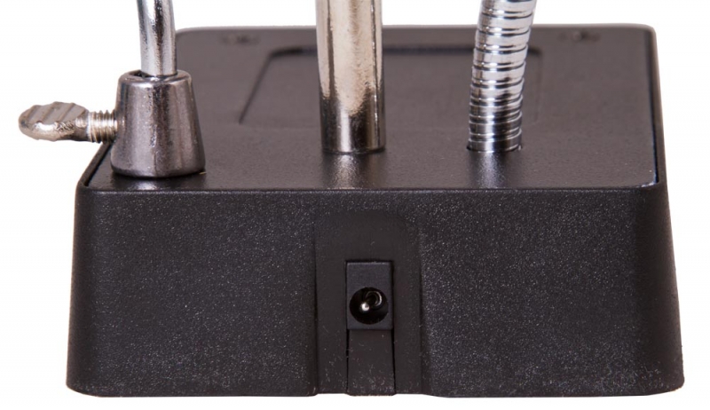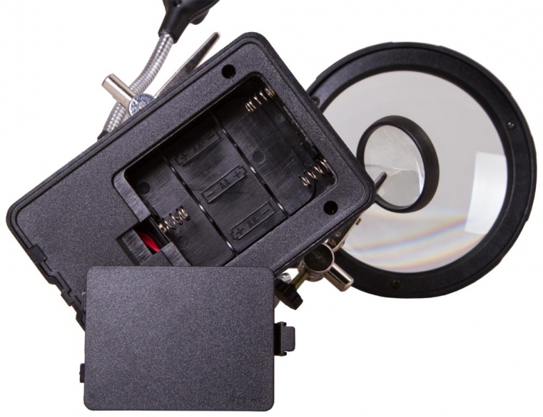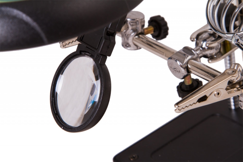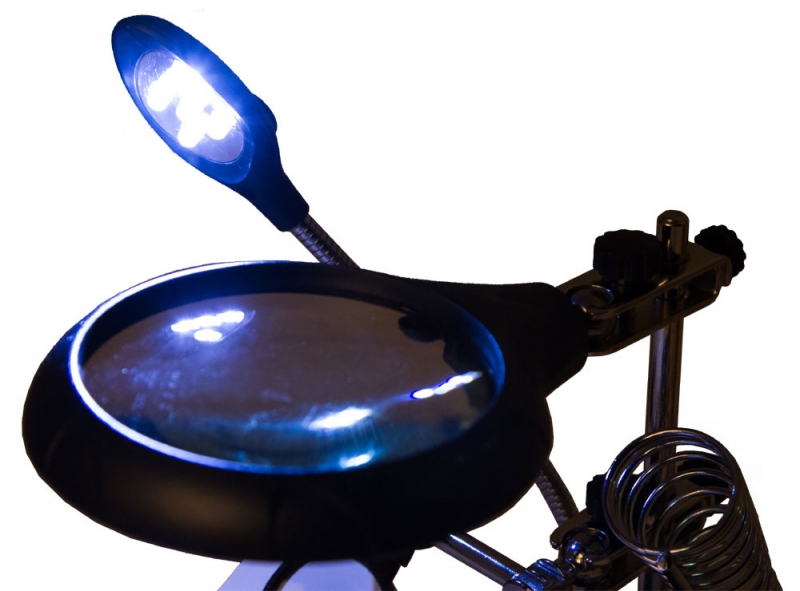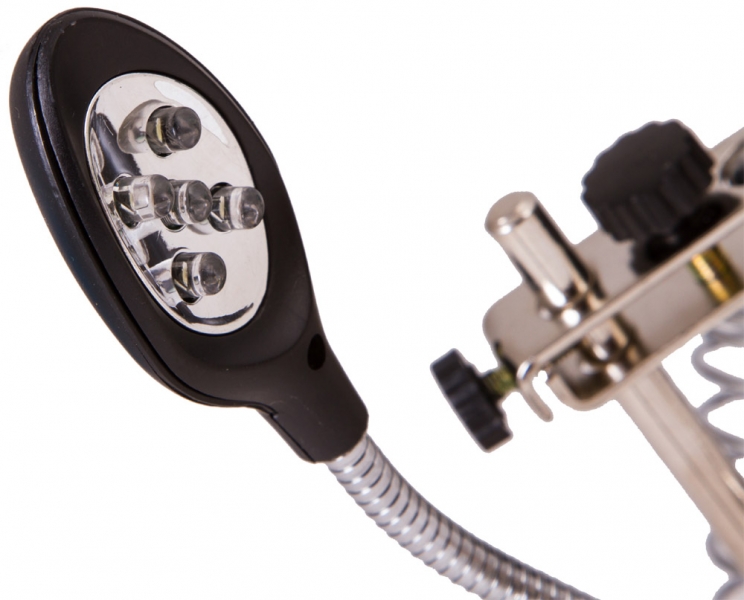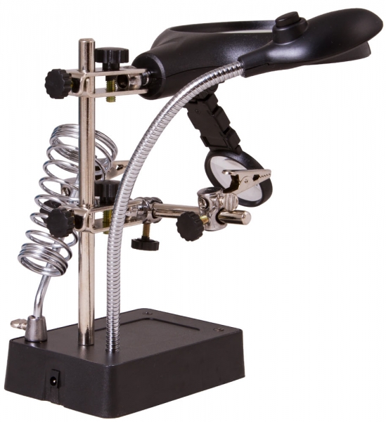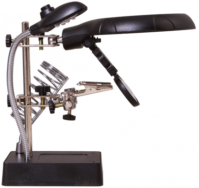 Лупа настольная Levenhuk Zeno Desk D11 Настольная лупа Levenhuk Zeno Desk D11 – отличный выбор для проведения точных работ. Она станет незаменимым оптическим инструментом для ювелира, часового мастера, моделиста, электротехника или инженера. Лупа позволяет изменять высоту линз над рабочей областью и фиксировать предметы при помощи держателей «третья рука». Есть в ней и встроенная подсветка. Две линзы из оптического пластика расположены друг под другом. Их можно использовать вместе или по отдельности. Рядом на гибком штативе закреплена подсветка. Она состоит из 5 ярких светодиодов и равномерно освещает рабочую область. Для ее питания необходимы батарейки или подключение к сети переменного тока. Под линзами вы найдете специальные держатели для небольших деталей – их называют «третья рука». Они предназначены для длительной работы с платами и масштабными моделями. Рядом расположен и держатель для паяльника. Все держатели съемные. Внимание! Помните, что напряжение сети в России и большинстве европейских стран составляет 220–240 В. Если вы хотите использовать устройство в стране с другим стандартом сетевого напряжения, необходимо включать его в розетку только через соответствующий конвертер (преобразователь напряжения).