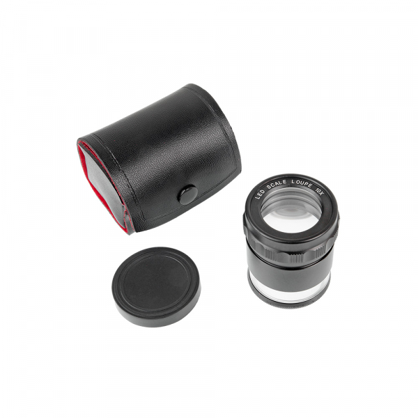 Лупа Veber 7175 измерительная с подсветкой (10х, 28мм) Измерения могут быть осуществлены как в дневном, так и искусственном (LED подсветка) свете с увеличением в 10 крат и с точностью 0,1 мм. Корпус лупы изготовлен из силумина с гальваническим покрытием. Подсветка осуществляется с помощью 8 микросветодиодов, расположенных у основания металлической части корпуса. Включение подсветки осуществляется тумблером на корпусе лупы. Батареи сменные (батарейки типа L936F 4 шт, в комплекте), рассчитаны на весь срок службы изделия. Высота прозрачной части корпуса (пластик) — 11 мм. Шкала (стекло, в металлической оправке, нанесена методом фотолитографии, трудноистираемая) крепится на резьбе снизу к прозрачной части корпуса. Для дополнительной защиты лупа снабжена пластиковой крышкой. Для хранения и транспортировки в комплекте идёт чехол из искусственной кожи на кнопке. Внутри чехла — бархатное покрытие.