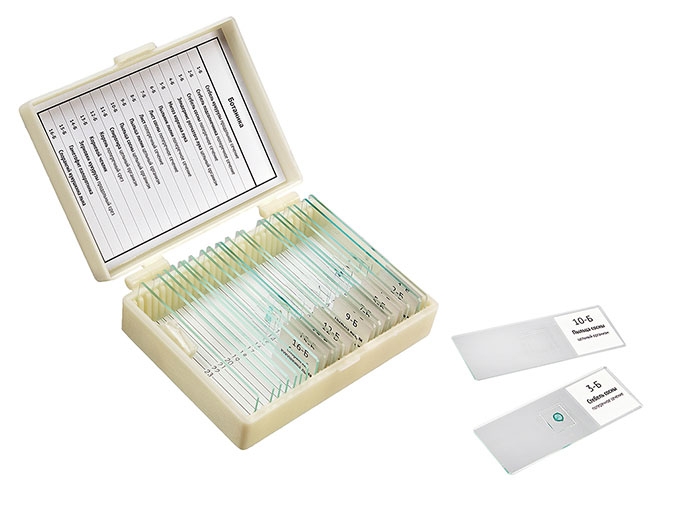 Учебный микропрепарат представляет собой предметное стекло срасположенным изакрепленным нанем объектом, уже подготовленным для исследования под микроскопом. Сверху объект накрыт тонким покровным стеклом. Размеры готовых препаратов стандартные (25мм х76мм) иподходят для использования слюбым биологическим микроскопом Микромед. 14 образцов, 10 предметных стекол, покровные стекла В наборе "Ботаника" Микромед №2, 16 образцов