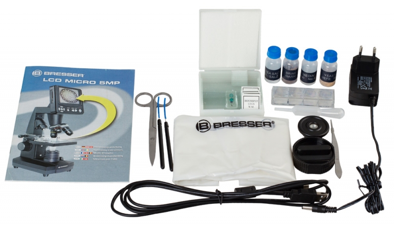 Вес: 3.376 кг. Размер упаковки (ДхШхВ): 22.0×19.0×39.5 см. Bresser LCD 50x-2000x – это отличный микроскоп, с помощью которого можно проводить изучение препаратов как в проходящем, так и в отраженном свете. Большой диапазон увеличения позволяет использовать прибор в самых различных областях. Микроскоп подходит для обучения школьников и студентов-биологов, исследований в области нумизматики или филателии, проведения работ с микроэлектроникой. Микроскоп комплектуется тремя объективами. Револьверное устройство позволяет быстро сменить кратность. Вместо окуляра используется цифровая камера 5 Мпикс с максимальным разрешением 3264x2448. Микроскоп дает оптическое увеличение в диапазон от 50 до 500 крат, а цифровой зум 4x позволяет получить увеличение до 2000 крат. Изображение выводится на цветной ЖК-дисплей с диагональю 3,5", благодаря чему микроскоп удобно использовать при групповых работах. Кроме того, увеличенное изображение микропрепарата можно сохранить в формате JPEG. Также имеется возможность записи видео в формате 3gp. На боковой стороне дисплея имеется слот для карт формата SD. Предметный столик с нониусом и препаратоводителем позволяет перемещать изучаемый объект, не прикасаясь к нему руками. Подсветка осуществляется с помощью светодиодов. Нижняя подсветка используется для изучения прозрачных объектов, а верхняя предназначена для исследования непрозрачных объектов в отраженном свете. Под предметным столиком расположен диск с 6 светофильтрами. Микроскоп Bresser LCD 50x-2000x имеет богатую комплектацию, что делает его незаменимым для начинающих биологов. В комплект входят не только необходимые для работы аксессуары, но и набор готовых микропрепаратов. Внимание! Помните, что напряжение сети в России и большинстве европейских стран составляет 220–240 В. Если вы хотите использовать устройство в стране с другим стандартом сетевого напряжения, необходимо включать его в розетку только через соответствующий конвертер (преобразователь напряжения).