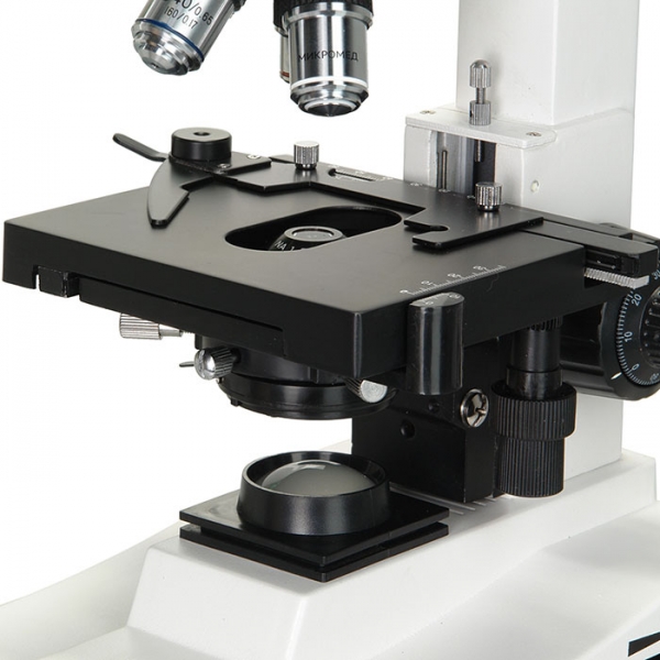 Микроскоп Микромед Р-1 представляет собой отличный инструмент по соотношению “цена-качество” для применения в учебной практике в микробиологии. Микроскоп оснащён всем необходимым в комплекте, и готов для работы сразу же из коробки. Благодаря простоте конструкции, и минимально необходимому обслуживанию, микроскоп способен долгое время проработать в учебном классе. Благодаря большому предметному столику размером 100 на 125 мм, с диапазоном перемещения 60х30 мм исследования можно проводить с гораздо большим комфортом, чем на моделях с фиксированным предметным столиком. Коаксиальный механизм грубой и точной фокусировки по своему принципу похож на тот, который применяется в микроскопах гораздо более высокого класса. Так же, коаксиальные рукоятки присутствуют и на предметном столике.