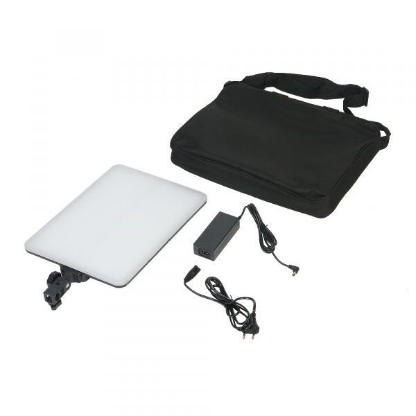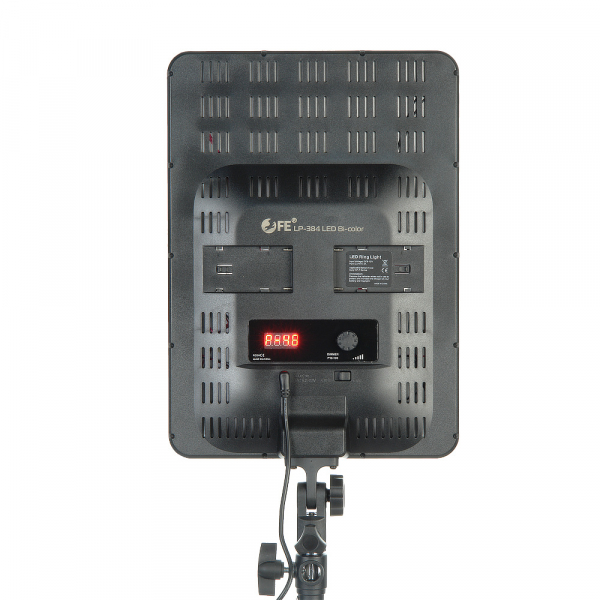 Осветитель светодиодный Falcon Eyes LP-384 LED Bi-color LP-384 LED Bi-color – легкие, простые в управлении безрамочные светодиодные осветители. Эти приборы можно использовать в студии, чтобы сформировать выразительный светотеневой рисунок, например для фэшн-съемки или записи интервью. Но особенно отчетливо достоинства почти невесомой (всего 800 г) и неприхотливой модели проявляются при работе на выезде. Матовая панель, закрывающая излучающую поверхность, создает равномерный световой поток и однородное освещение без дополнительного рассеивающего фильтра. При этом мощности прибора достаточно, чтобы дополнить и, главное, скорректировать естественный свет или убрать с лиц ненужные тени, например при съемке на улице. Экономный расход энергии – неотъемлемое качество биколорного прибора, у которого общее потребление энергии всегда меньше, чем у аналогичного моноколорного – помогает сберечь заряд аккумуляторов и продлить время автономной работы. Например, от 2 батарей типа NP-F емкостью по 6700 мА·ч прибор сможет непрерывно работать около 4 часов. Цифровой дисплей с подсветкой отображает текущие значения яркости и цветовой температуры, которые плавно регулируются валкодером. Кронштейн позволяет установить осветитель на любые стойки, штанги и другие опорные системы с посадочным местом 5/8”, отрегулировать его наклон в пределах 180° и осветить объект под нужным углом. Пассивная система охлаждения позволяет использовать при съемке с одновременной записью звука. Сумка с уплотненными стенками и наплечным ремнем служит для бережной транспортировки и хранения осветителя.