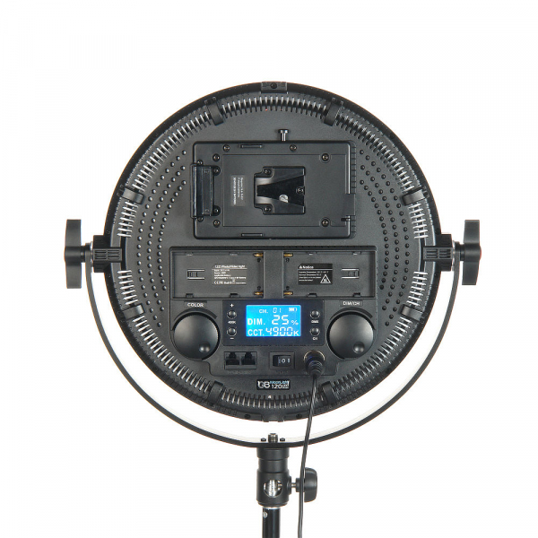 Осветитель светодиодный GreenBean MoonLight 120 LED bi-color Мощный светодиодный осветитель GreenBean MoonLight 120 LED bi-color - круглая световая панель с изменяемой цветовой температурой. Источники света — 600 ярких SMD светодиодов с высоким уровнем цветопередачи (CRI более 95). Максимальная мощность — 67 Вт. В отличие от традиционно используемых софтбоксов, осветитель GreenBean MoonLight имеет абсолютно круглую матовую (через которую не видны излучающие светодиоды) поверхность, малые габариты и может создавать красивые круглые блики на глянцевых отражающих поверхностях. В осветителе используется две группы светодиодов с температурой 3200 К и 5600 К, каждая номинальной мощностью 60 Вт. Электрическая схема блока питания осветителя ограничивает общую мощность световой панели величиной 67 Вт. Установив (зафиксировав) необходимую мощность панели (максимум 67 Вт), пользователь может плавно менять цветовую температуру. Регулировка мощности бесступенчатая — от 10 до 100% Конструкция Корпус осветителя изготовлен из ударопрочного ABS пластика, на передней части корпуса расположен белый молочный светорассеиватель диаметром 28 см. На задней части корпуса расположены элементы управления осветителем, LCD экран с подсветкой, разъёмы DMX тип RJ45, разъём питания, разъёмы для установки аккумуляторов и тумблер питания. Протокол DMX-512 позволяет подключать и объединять в группы не только осветители GreenBean MoonLight 120 LED bi-color, но и различные устройства других производителей (прожекторы, осветители и т.д.) к пульту управления (существуют и беспроводные передатчики и приемники для управления по DMX). Сверху на корпусе расположен «холодный» башмак для установки аксессуаров (приобретаются отдельно): например, микрофонов, держателей для смартфонов и т. д. . Лира осветителя изготовлена из алюминиевого сплава. Осветитель может наклоняться на лире на угол 180° и фиксироваться в этом положении с помощью двух винтовых зажимов по обеим сторонам. Установка осветителя осуществляется на стандартную стойку со шпиготом 5/8 дюйма; предусмотрена возможность горизонтальной установки лиры осветителя. Фиксация лиры на стойке — винтовая. Активная система охлаждения с бесшумными вентиляторами не создаёт помех при звукозаписи и допускает длительную работу осветителя без необходимости делать перерывы во время съёмки для его «остывания». Дистанционное управление Для дистанционного управления осветителем, в комплекте с ним предусмотрен пульт 2.4 ГГц. С помощью него можно настраивать мощность и цветовую температуру, а также выбирать канал управления или полностью отключать питание прибора Текущие параметры работы отображаются на экране. Питание пульта осуществляется от 2-х батареек типа «ААА». Два варианта питания осветителя В студии: комплектный блок питания с сетевым кабелем. На выезде: возможно подключение аккумуляторов NP-F (питание осуществляется только от двух аккумуляторов одновременно) или V-mount. Для длительной автономной работы, можно установить все три аккумулятора. Аккумуляторы NP-F и V-mount приобретаются отдельно. Выбор источника осуществляется трёхпозиционным тумблером на корпусе осветителя. Сумка-чехол Для хранения и транспортировки в комплекте предусмотрена сумка-чехол на молнии.