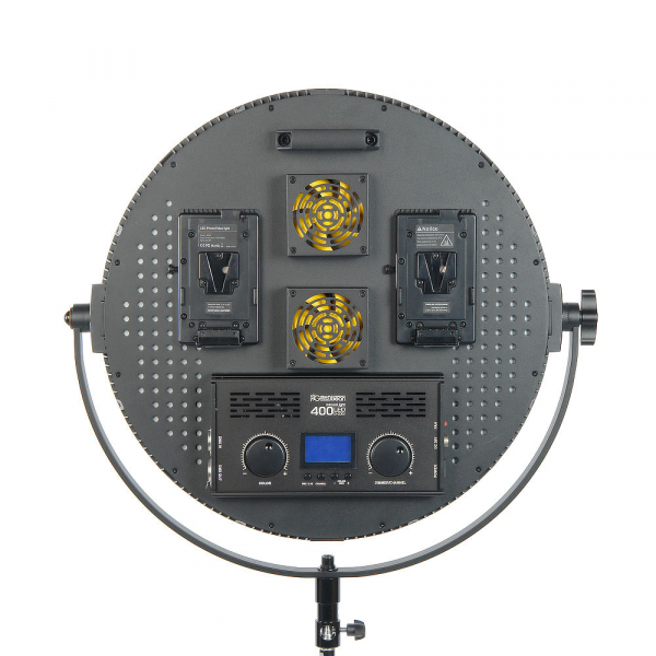 В студии: комплектный блок питания с сетевым кабелем. На выезде: возможно подключение аккумуляторов V-mount (питание осуществляется только от двух аккумуляторов одновременно). Аккумуляторы приобретаются отдельно. Выбор источника осуществляется трёхпозиционным тумблером на корпусе осветителя.