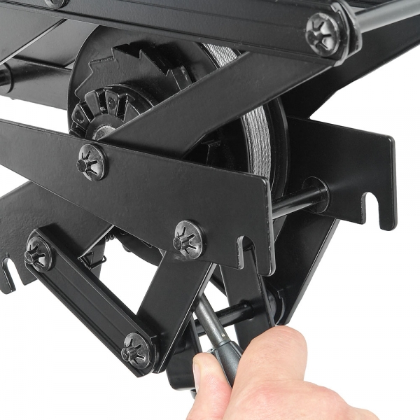Крепление к верхней каретке и крепление оборудования к пантографу осуществляется стальным пальцем диаметром 5/8 дюйма (16 мм) и имеет защитный винт исключающий выпадение пальца каретки. Дополнительно, оборудование на пантографе страхуется от падения стальным тросиком (Д=2 мм) с металлическим карабином.