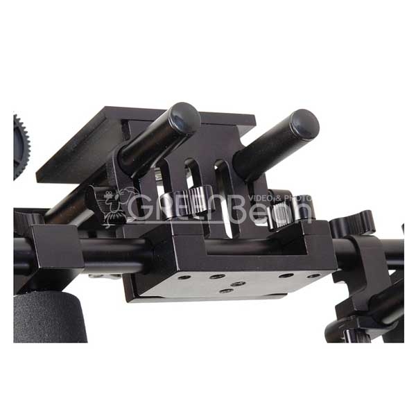 Компактный, легкий и недорогой, но профессионально исполненный плечевой упор для видеосъемки DSLR или HDV камерами. Все его элементы, за исключением поролона ручек, обшивки наплечника и заглушек изготовлены из алюминиевого сплава с высококачественным оксидным покрытием. К направляющей длиной 300 мм (диаметр 16 мм) крепится консоль с двумя рукоятками. Рукоятки металлические длиной 150 мм, обтянуты плотным поролоном. Максимальное расстояние между их осями составляет 230 мм. Угол наклона рукояток и их взаимное положение на консоли можно изменять. Узел площадки камеры также устанавливается на консоли и фиксируется двумя барашками. Возвышение площадки для камеры над консолью составляет 70 мм. Снизу этого узла имеются 6 резьбовых отверстий ¼ дюйма для установки RIG03 на штатив или «апгрейда» держателями дополнительного оборудования.