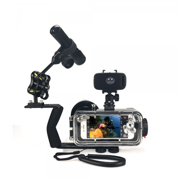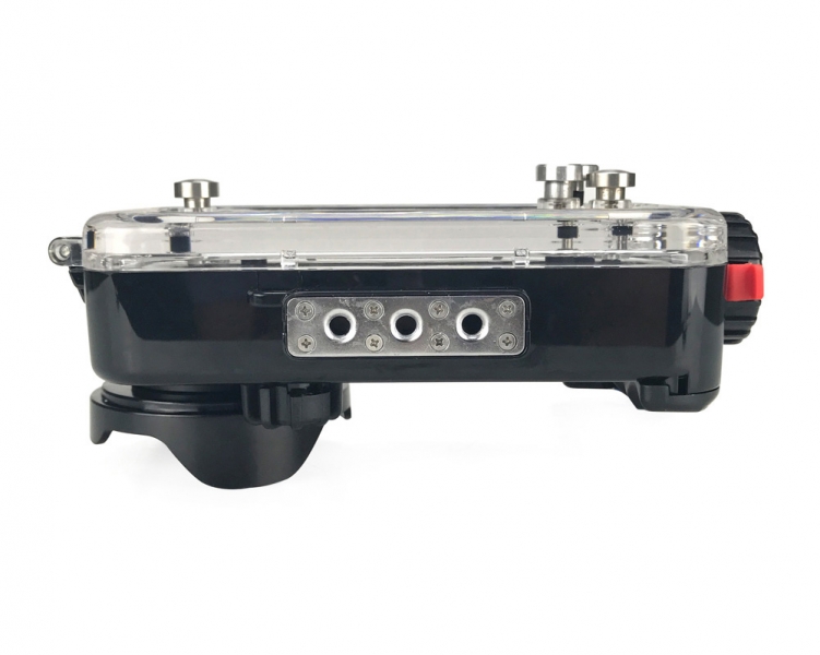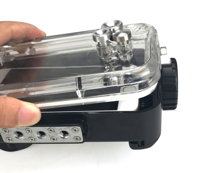 Три штативных гнезда снизу бокса, а также крепление типа "холодный" башмак, позволяет крепить рукоятки и армов для подводных фонарей. Также бокс может использоваться, как защитный чехол для вашего смартфона.