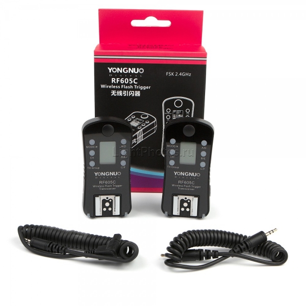 Радиосинхронизатор Yongnuo RF-605C для Canon позволяют запускать накамерные вспышки дистанционно в ручном режиме, с выдержкой до 1/200 - 1/320 сек. Синхронизатор Yongnuo RF-605C выполнен в виде трансивера и может использоваться как приемник, так и передатчик. Наличие 16 каналов в 6 независимых группах позволяют запускать разные вспышки, что очень удобно для постановочной съемки со сложными световыми схемами и для студийной работы. На триггере имеется небольшой LCD экран отображающий текущие установки.