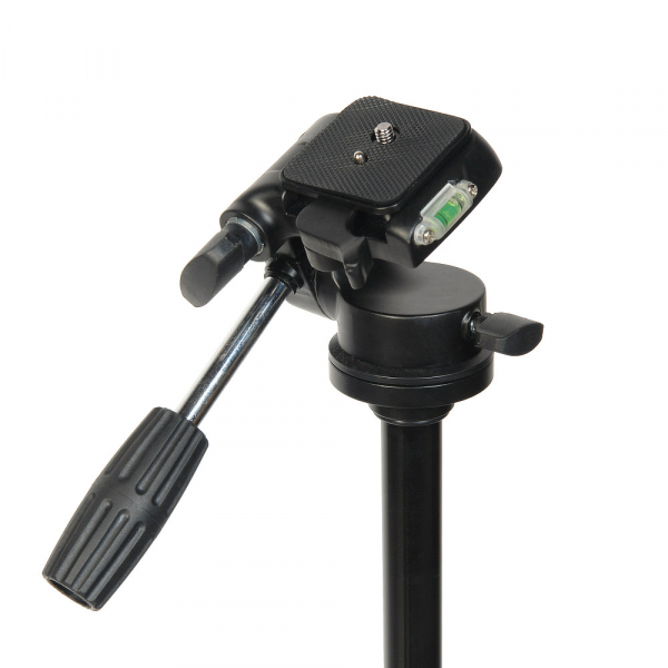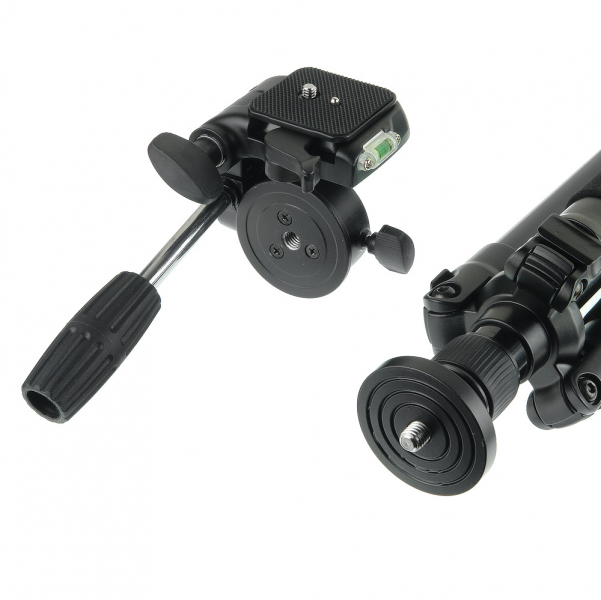 Плавно, с усилием поворачивать камеру на 360° вокруг своей оси и на –90 до +45° по вертикали позволяет 3D-штативная голова со съемной рукояткой (13 см). Голова сменная, выполнена из алюминиево-магниевого сплава. Градуированная шкала и пузырьковый уровень помогают отрегулировать угол наклона камеры. Быстросъемная площадка оборудована винтом 1/4” для установки оборудования. Основание для площадки можно поднять на 90° и зафиксировать винтовым зажимом. Таким образом положение камеры можно изменять по трем осям для точного позиционирования во время съемки.