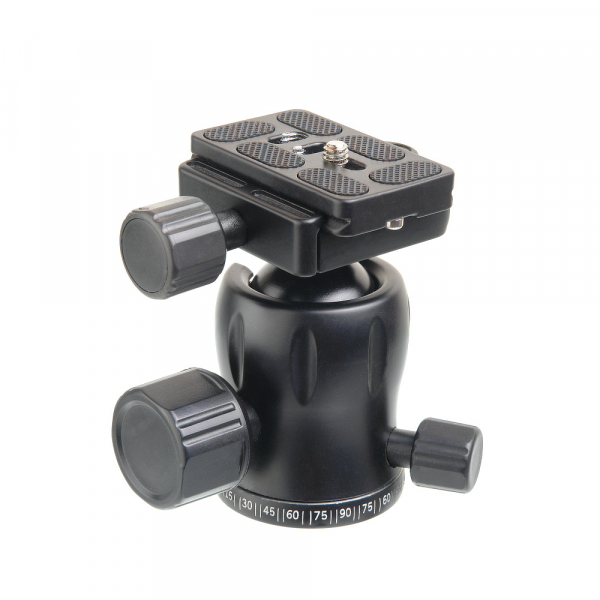Штативная голова Falcon Eyes BH-39 Falcon Eyes ВН-39 — шаровая головка для установки камер на штативы и другие опоры с посадочным винтом 3/8”. Конструкция из алюминиево-магниевого сплава дает возможность быстро выбрать и надежно зафиксировать нужное для съемки положение камеры весом до 15 кг. Для крепления камеры служит быстросъемная площадка размером 60х38,5 мм с конгрессным винтом ¼” и резиновыми накладками. Площадка устанавливается в базу с пазами и фиксируется винтом. От случайного выпадения она застрахована 2 упорами. Для выравнивания положения камеры база оснащена пузырьковым уровнем. Свободное, без рывков движение шара позволяет плавно перемещать камеру, наклонять ее под углом до 90°. Наклон площадки закрепляется винтом с большой удобной рукояткой. Головка дает возможность горизонтального панорамирования на 360°. На поворотном диске в основании конструкции предусмотрена шкала с шагом 5°. Положение головки относительно шкалы фиксируется винтом. Прочное покрытие, нанесенное на корпус и шар методом глубокого анодирования, обеспечивает высокую износостойкость конструкции.