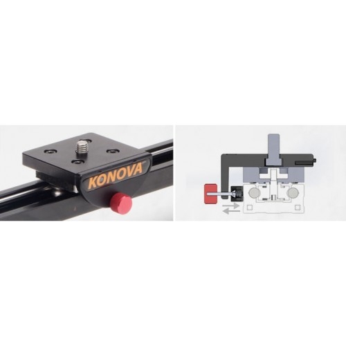 Шершавое покрытие проходит термическую обработку и тщательно шлифуется. Такая технология обработки помогает добиться максимально гладкой поверхности рельс. После прохождения термической обработки поверхность рельс становится зеркально гладкой. В дополнение ко всему, двойные подшипники, которыми оборудованы модели слайдеров К3 и К5, с косым примыканием обеспечивают максимально точное, плавное и бесшумное передвижение камеры по рельсам. Вертикальное положение: При установке слайдера на штатив в вертикальном положении необходимо использовать штативную или панорамную головку. Также возможна установка без использования вышеупомянутых устройств. Установка слайдера в вертикальном положении позволяет вести съемку из нижнего ракурса, что является одним из важнейших преимуществ данной модели перед современными аналогами. Слайдер также можно закрепить вертикально при помощи винтов 1/4" и 3/8", отверстия для которых расположены с обеих сторон слайдера. Диагональное положение: Штатив или головку можно прикрепить к нижней части рельс слайдера. Слайдер Konova совместим с головкой или адаптером 3/8"- 5/8" (поставляется отдельно). Возможна установка камеры под любым углом. Высота ножек регулируется, что позволяет установить слайдер под наклоном. При необходимости рельсы с легкостью снимаются с ножек. Горизонтальное положение: Далеко не все случаи требуют передвижения камеры именно слева направо, однако же, такое положение слайдера используется наиболее часто. Такое положение позволяет приближать и отдалять камеру от предмета съемки. Позволяет добиться высочайшего качества результата и воплотить все творческие идеи в реальность. Отверстия для крепежных винтов 1/4" и 3/8" позволяет установить дополнительное оборудование для съемки на нижней части слайдера. Штатив очень удобен для установки слайдера в горизонтальном положении. Ножки: Ножки позволяют прочно и надежно зафиксировать слайдер на любой поверхности. Оборудованы мягкими резиновыми наконечниками, которые защищают поверхность от царапин и обеспечивают более прочную установку слайдера. Положение каждой ножки регулируется отдельно: ее можно установить в любой позиции под любым углом, что также является преимуществом и отличием данной модели от аналогов. Ножки очень легкие, а их установка занимает считанные минуты. Надежная фиксация камеры: Слайдер данной модели прочно и надежно фиксирует камеру, что предотвращает появление малейшей тряски в кадре. Сам слайдер также не вибрирует во время работы. Существует два способа предотвратить возникновение вибрации. Первый способ заключается в регулировке плотности закручивания винта, что в свою очередь регулирует натяжение пружины. Второй способ предполагает использование гаечного ключа, который поставляется в комплекте с данной моделью и является более удобным и точным. Масляные сальники: Масляное покрытие наносится на шершавую поверхности, что необходимо для ее максимального сглаживания. Процесс так называемой сверхтонкой обработки очень важен для беспрепятственного и плавного скольжения камеры по рельсам слайдера. В дополнение, двойные подшипники с косым примыканием делают движение еще более плавным и бесшумным. Линейка: В комплекте поставляется 2 линейки с клейкой оборотной частью. Устройство позволяет точно замеря