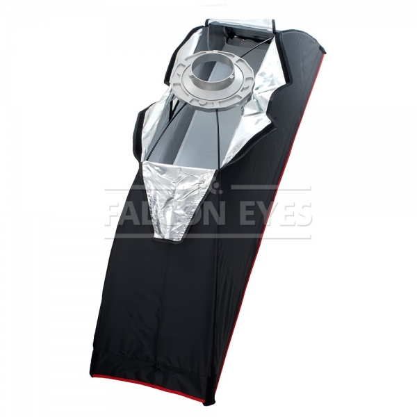 Софтбокс Falcon Eyes Софтбоксы с соотношением сторон более чем 1:3 называют стрипбоксами, их используют для ростовой съемки, создания градиентной подсветки на фоне, в предметной съемке для получения яркого длинного блика, и там, где нужно получить направленный узкий свет, например для подсветки волос и плеч сверху. Изготовлен из жаропрочного материала, на стенках расположены вентиляционные карманы для отвода тепла. Рабочая поверхность софтбокса выполнена из качественной жаропрочной синтетической ткани с высокоотражающей металлизированной серебристой (нефактурной) поверхностью, рассчитана на длительную эксплуатацию при интенсивной работе в студии, не отслаивается и не меняет отражающие свойства в течение длительного времени. Для циркуляции воздуха внутри изделия и отвода избыточного тепла имеются два вентиляционных окна.
