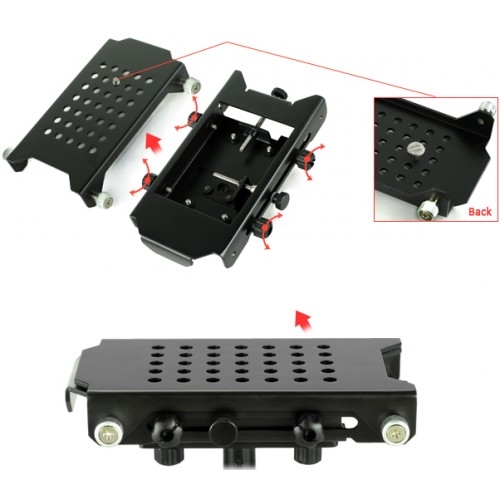 • Быстросъемная площадка для камеры. Площадка оборудована отверстиями для крепежных винтов 1/4" и 3/8", что делает ее совместимой с более широким рядом моделей камер. Положение площадки регулируется как в горизонтальной, так и вертикальной плоскостях (вперед, назад и из стороны в сторону), что позволяет более точно сбалансировать камеру.