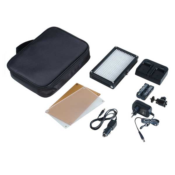 Цифровой контроллер работающий по методу широтно-импульсной модуляции (многоступенчатое диммирование без мерцания в выбранном положении) позволяет регулировать яркость прибора от 10 до 100%. В комплект входит: 2 аккумулятора емкостью 2200 мАч каждый, зарядное устройство на 2 аккумулятора, сетевой и автомобильный адаптеры питания, кронштейн с шаровой головкой и посадочными разъемами «башмак» и 1/4", фильтр понижающий цветовую температуру (3200К), матовый рассеивающий фильтр, удобная сумка-чехол с ручкой и жесткими стенками. Емкости аккумуляторов хватит примерно на 100 минут автономной работы, на панели управления находится кнопка индикации заряда батареи. Осветитель может работать от сетевого или автомобильного адаптера питания из комплекта.