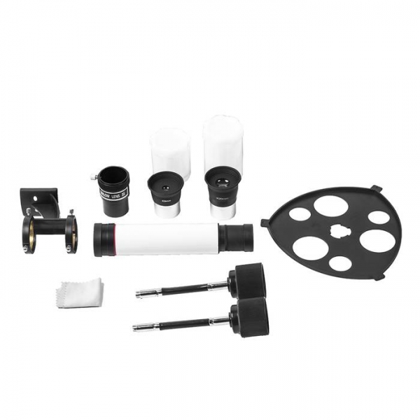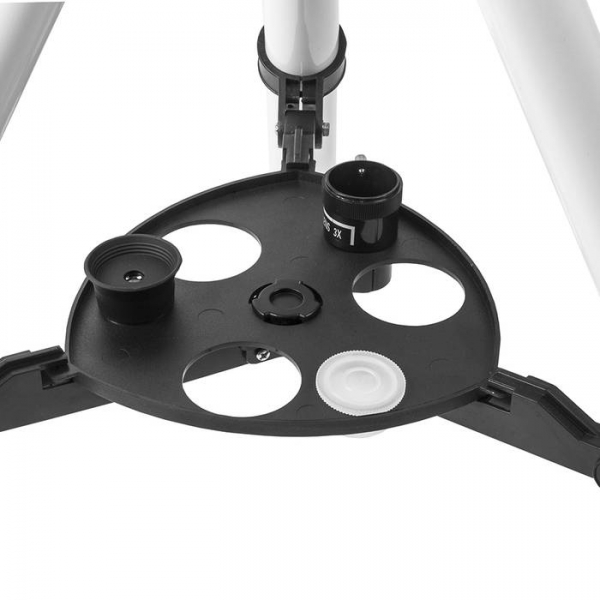 Телескоп Veber 900*90 AZ Белый - это солидный линзовый телескоп (рефрактор), который дает четкое, контрастное изображение. Просветленный ахроматический объектив с диаметром 90мм, собирает света на 60% больше, чем 70мм и позволяет наблюдать не только небесные, но и очень удаленные земные объекты. Картинка резкая, без окрашенности изображения по краю поля зрения. В этот телескоп вы сможете увидеть детали на дисках планет, кратеры Луны, многие туманности и звездные скопления (вплоть до 13 m звездной величины). Для земных наблюдений мы рекомендуем использовать окуляр PL20 , с которым увеличение телескопа будет 45х, при этом ближняя точка фокусировки составит 22,5м Обратите внимание, этот телескоп дает прямое (не перевернутое) изображение. Кроме того, наличие в окулярном блоке оборачивающей призмы (а не диагонального зеркала, как в аналогичных моделях других фирм), делает изображение изображение не зеркальным (где левое и правое меняются местами), а таким, каким вы видите его невооруженным глазом. Для удобства наблюдения (из положения стоя или сидя), окулярную часть вместе с призмой можно поворачивать, 8 фиксированных положений. С помощью искателя (входит в комплект, увеличение 6х, крепится к телескопу) можно быстро навестись на цель наблюдения. Телескоп снабжен азимутальной монтировкой AZ (металл). Такой монтировкой удобнее пользоваться если вы наблюдаете наземные объекты. Всего одна ручка позволяет управлять прибором и по вертикали и по горизонтали. Имеется фиксатор найденного положения. Телескоп поставляется со стальным штативом с возможностью регулировки высоты. Распорки для ножек служат не только для повышения устойчивости, но и в качестве подставки под полочку для аксессуаров (идет в комплекте). Сумка для переноски, в которую укладывается весь комплект, позволяет безопасно (для оптики и внешнего вида) транспортировать прибор для выездов на природу или при походах в гости.