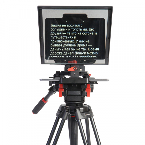 Телесуфлер GreenBean Teleprompter Tablet GreenBean Teleprompter Tablet располагается перед камерой и позволяет диктору достичь постоянного зрительного контакта с аудиторией, а также обеспечивает возможность ведения прямого эфира практически без сбоев в произнесении текса. Teleprompter Tablet предназначен для использования в теле- и видеопроизводстве для съемок телепрограмм, интервью, презентационных фильмов, рекламных роликов, музыкальных клипов, интервью, видеоблогов и других видов съемок. Teleprompter Tablet может использоваться как в студии, так и за ее пределами. Складная конструкция, размещаемая в кейсе, обеспечивает легкость и удобство транспортировки и быструю подготовку к работе даже в полевых условиях. Teleprompter Tablet позволяет использовать любой планшетный компьютер или смартфон на базе iOS или Android. Держатель планшета имеет ширина захвата 145-235 мм (поддерживает в том числе iPad mini, iPad Pro, Surface Pro), а с входящим в комплект ограничителем можно установить устройство шириной до 115 мм. Раздвижная несущая платформа с винтами 1/4" и 3/8" позволит установить большинство популярных камер (например Sony a7S на сложенной площадке, Canon C100 в среднем положении и Panasonic DVX200 на разложенной площадке), диапазон перемещения установочного винта с площадкой – 330 мм. Уровень несущей платформы обеспечивает правильное положение габаритной камеры, а для установки камер меньшего размера (например DSLR) используется дополнительный элемент, который устанавливается на верхней каретке и поднимает камеру на нужный уровень. Для крепления платформы к штативу предусмотрены несколько монтажных отверстий (четыре – 3/8" и два – 1/4"), что обеспечивает лучшую стабильность и сбалансированность. Тубус для зеркала изготовлен из пластика путем термовакуумной вытяжки. В задней части тубуса имеется текстильный чехол, который защищает объектив камеры от паразитной засветки студийными осветителями. Teleprompter Tablet совместим с 15-миллиметровой рельсовой системой с расстоянием между рельсами 60 мм (от оси до оси). Проводной пульт дистанционного управления позволяет ассистенту или диктору самостоятельно управлять движением текста на суфлере. Длина кабеля 3 м, разъем миниджек 3,5 мм, питается от батареи CR2032. Для подготовки и организации просмотра текста с помощью телесуфлера можно использовать приложения, доступные в магазинах App Store, Google Play и других. В комплект поставки входит жесткий алюминиевый кейс с поролоновыми вставками и ячейками для безопасной переноски и бережного хранения.