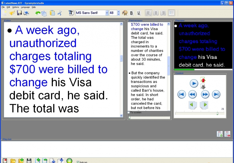 • Online редактирование текста и PlayList-a. Параллельно с выводимым текстом может производиться редактирование текста и PlayList-a.